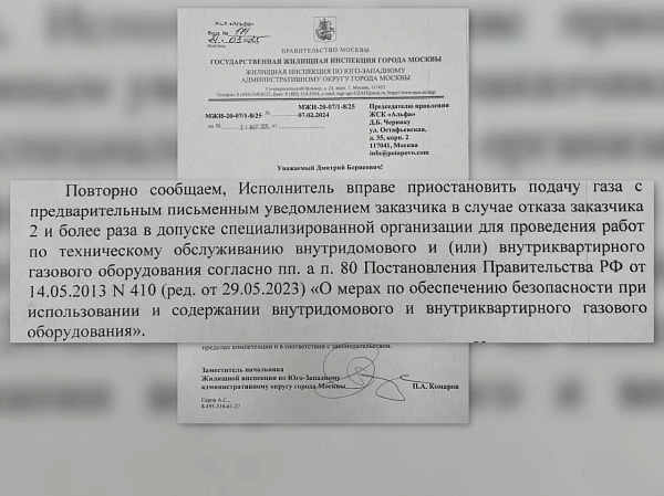 Согласно разъяснениям Жилищной инспекции по Юго-Западному административному округу г. Москвы в целях обеспечения безопасности, сохранения жизни и здоровья жителей Кооператива ЖСК «Альфа» вправе приостановить газоснабжение в домовладения тех абонентов, которые отказывают сотрудникам газовой службы в доступе к газовому оборудованию для проведения техобслуживания.