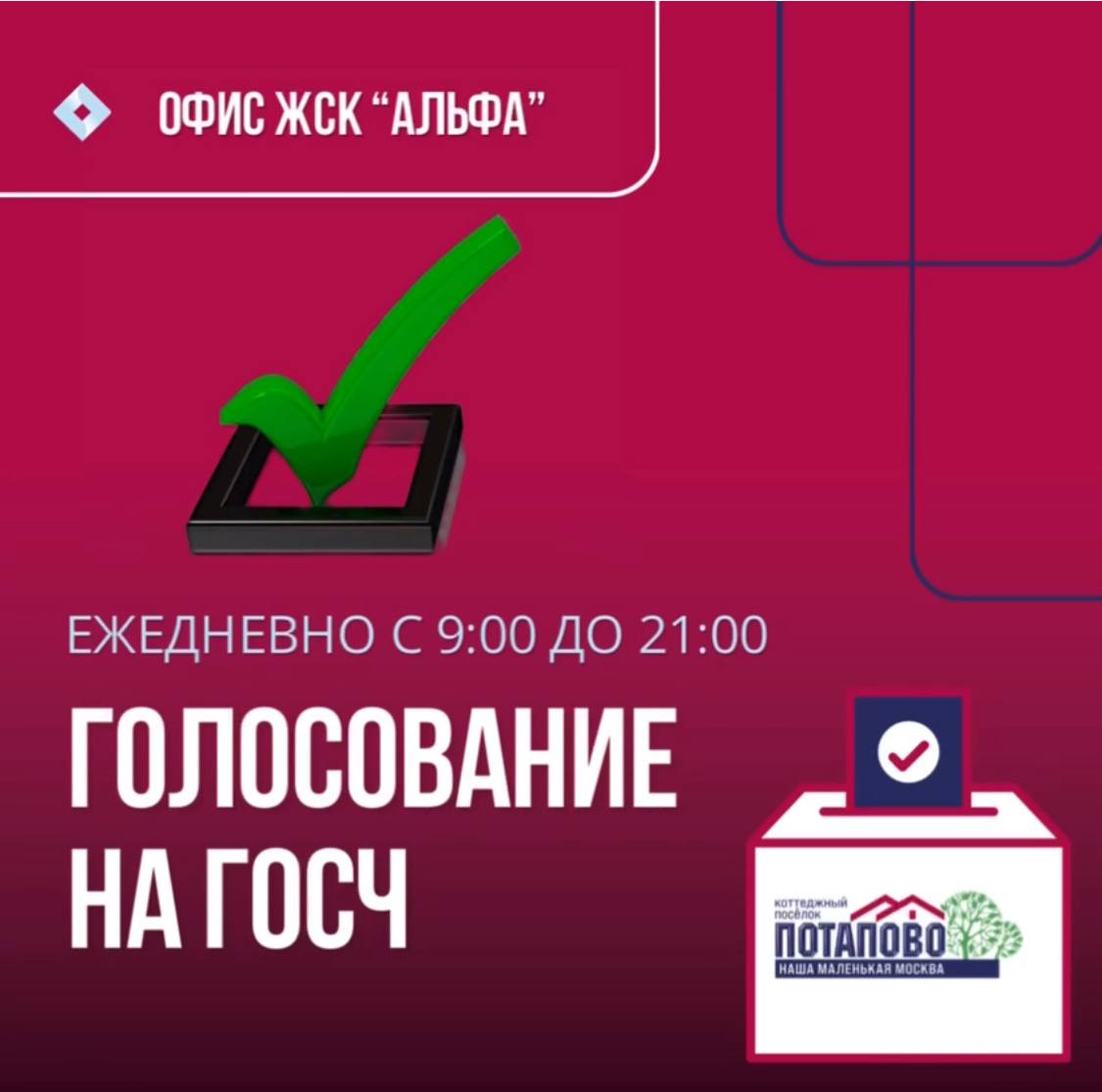 Для вашего удобства график работы офиса ЖСК «Альфа» подстроен под проведение ГОСЧ. Каждый день с 9 и до 21 часа вы можете проголосовать на годовом собрании!
