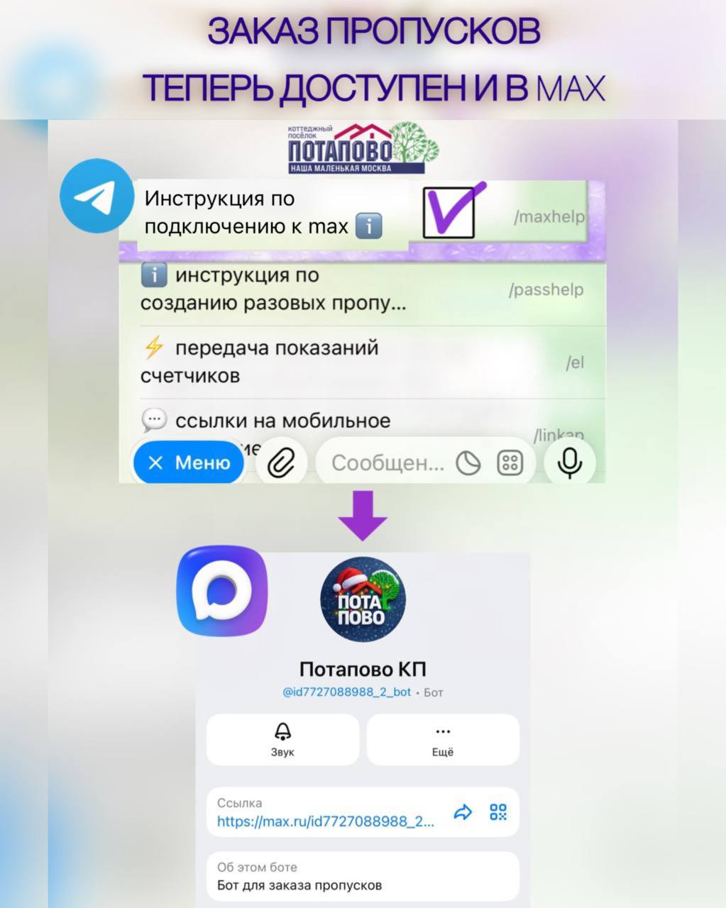 Соседи! Для вашего удобства и беспрепятственного заказа пропусков бот Потапово теперь функционирует и в мессенджере MAX.